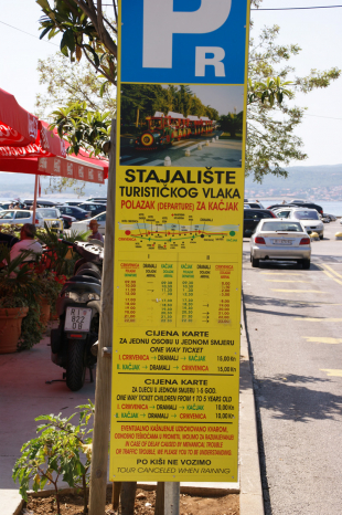 O turistickém vláčku Felix jsem se tu na webu zmiňoval v různých článcích, naposledy například v Pedofil v autokempu Kačjak aneb moje zkušenosti s chorvatskou policií. Z Crikvenice do Kačjaku se s vláčkem dostanete za 15 kun, děti do pěti let platí 10 kun. Stejná cena platí pro cestu z Crikvenice do Selce. Vláček jezdí několikrát denně, viz obrázek.